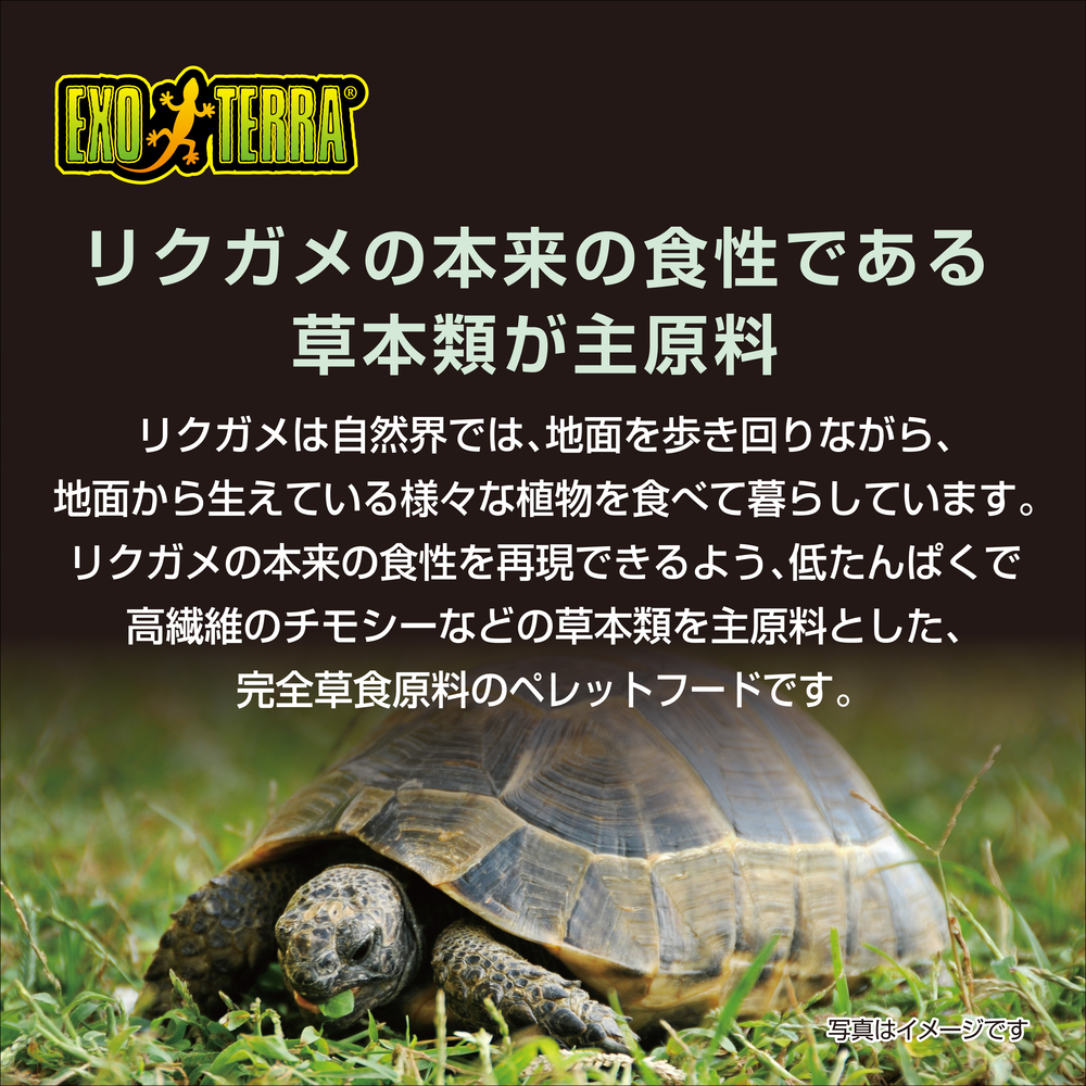 ●リクガメの本来の食性である草本類が主原料。リクガメは自然界では、地面を歩き回りながら、地面から生えている様々な植物を食べて暮らしています。リクガメの本来の食性を再現できるよう、低たんぱくで高繊維のチモシーなどの草本類を主原料とした、完全草食原料のペレットフードです。